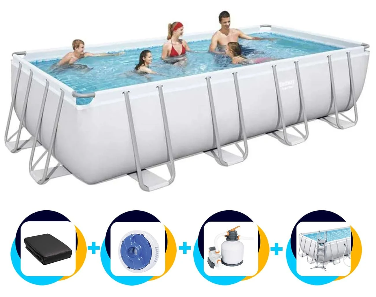 Het Power Steel zwembad wordt geleverd inclusief een zandfilterpomp (pompcapaciteit 5678 liter/uur) voor schoon en helder zwembadwater, een chloordispenser voor chloortabletten, een afdekzeil en een handige zwembadtrap.