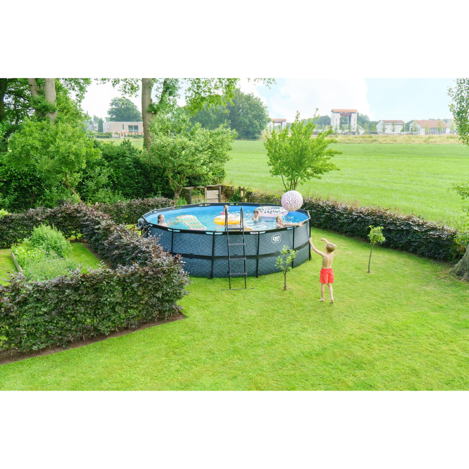 Het Black Leather zwembad heeft een luxe leren uitstraling. Door de zwarte buitenkant en lichtgrijze binnenkant staat er een stijlvol en modern zwembad in de tuin. Het EXIT zwembad is uitgevoerd met sterke 3-laags wanden van pvc en polyester. De ronde vorm van het zwembad creëert een gezellige sfeer en zorgt ervoor dat je eenvoudig met meerdere personen plezier kunt beleven in het zwembad. Ontdek wie het snelst een baantje kan trekken, dobber samen rond op een luchtbed of duik speeltjes van de bodem op. Kortom: met de ronde zwembaden van EXIT Toys verveel je je geen moment.